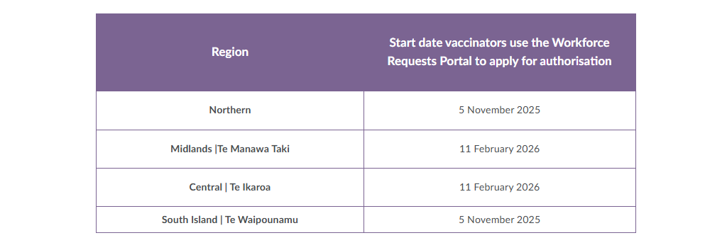This new process is phased in from 5 November 2025, with Northern and South Island regions being the first to use the national Workforce Requests Portal from 5 November 2025. Midland and Central regions will continue to use current processes until 11th February 2026. The table below identifies when vaccinators will start using the portal in each region.